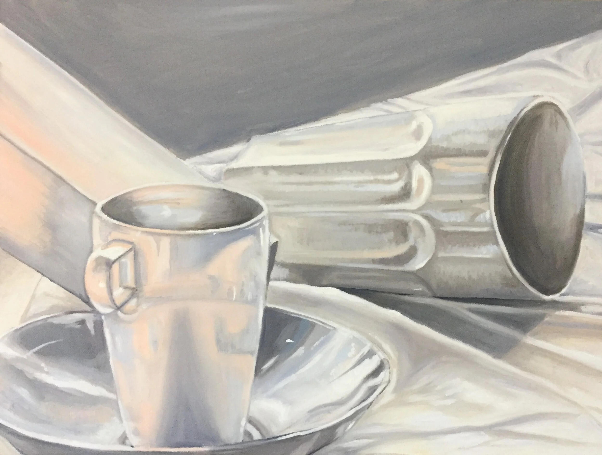 "Memory" -Oil on Canvas, 2018 "Agony" -Oil on Canvas, 2019 "Pastry" - Oil on Gesso Paper, 2018 "White Still Life" -Oil on Canvas, 2018 "Veggies and Fruit" -Oil on Gesso Paper, 2018 Reach, Charcoal on Paper, 2018 18x24 inches